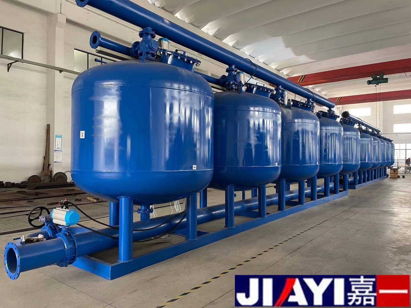 該產品是根據客戶需求重組設計的,是采用15個單列砂罐串聯在一起的一種過濾器,五個罐組成一列,進出水管,排污管都是五臺同一水管,然后匯總到總的出水管。每一列進出水管都設有手動渦輪蝶閥,便于維護保養。總的進出水口都設有總的手動渦輪蝶閥,各列裝有壓差變送器,放空閥,排氣閥。從而保證整套設備,在給水系統中滿足使用要求,運轉平穩。