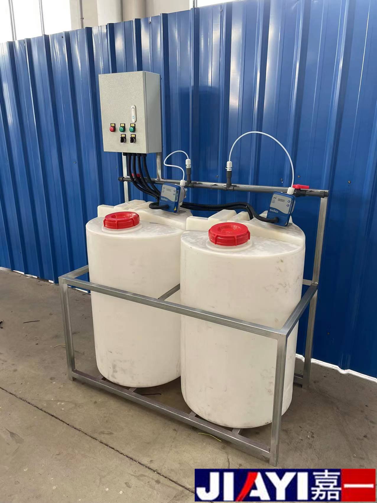 全自動加藥裝置采用時間程序控制,此控制方式無需儀表的支持,首先根據系統的運轉需要設定自動加藥的周期、加藥量、加藥時間和加藥頻率。在以后的系統運轉過程中,到加藥周期,計量泵自動打開加藥,加到規定的時間計量泵關閉;到排污周期,計量泵停止加藥,排到規定的時間后,計量泵繼續開啟,補充排污損失掉的藥劑,把系統的含藥量維持在正常的水平、加到規定的時間計量泵關閉。